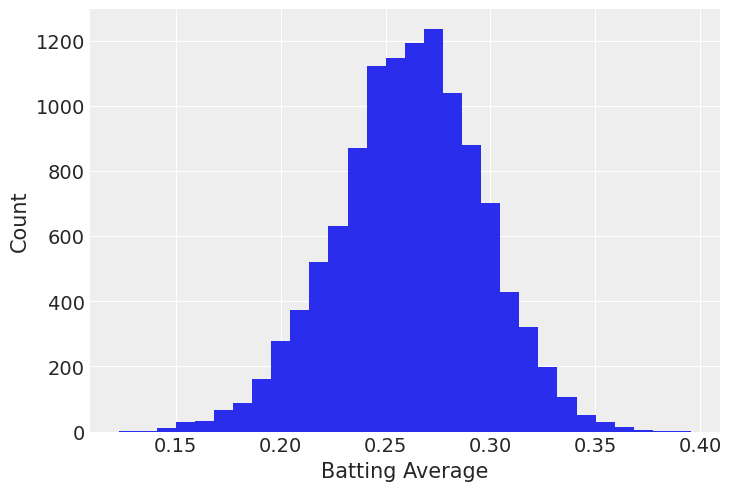 In the Hierarchical Logistic regression with Binomial family notebook, we modeled baseball batting averages (times a player reached first via a hit per times at bat) via a Hierarchical Logisitic regression model. If we’re interested in league-wide effects, we could look at a Beta regression. We work off the assumption that the league-wide batting average follows a Beta distribution, and that individual player’s batting averages are samples from that distribution.