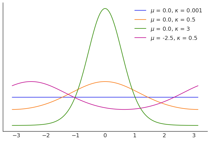 There are a few circular distributions, one of them is the VonMises distribution, that we can think as the cousin of the Gaussian that lives in circular space. The domain of this distribution is any interval of length \(2\pi\). We are going to adopt the convention that the interval goes from \(-\pi\) to \(\pi\), so for example 0 radians is the same as \(2\pi\). The VonMises is defined using two parameters, the mean \(\mu\) (the circular mean) and the concentration \(\kappa\), with \(\frac{1}{\kappa}\) being analogue of the variance. Let see a few example of the VonMises family: