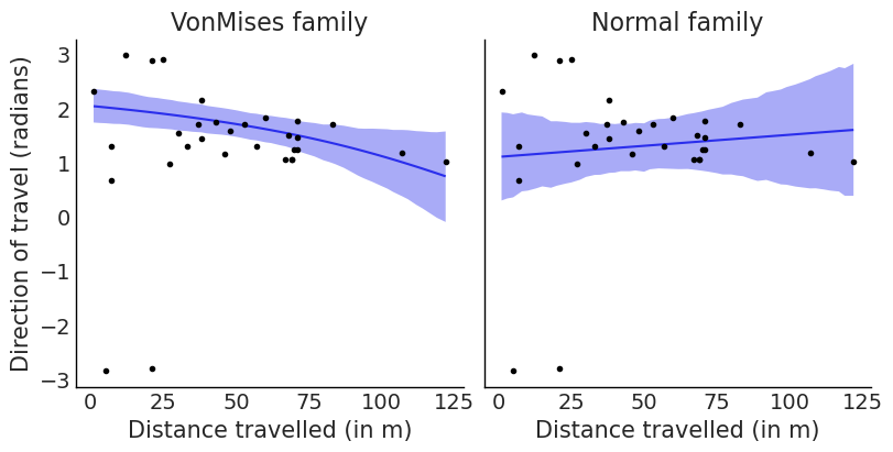 Bambi supports circular regression with the VonMises family, to exemplify this we are going to use a dataset from the following experiment. 31 periwinkles (a kind of sea snail) were removed from it original place and released down shore. Then, our task is to model the direction of motion as function of the distance travelled by them after being release.