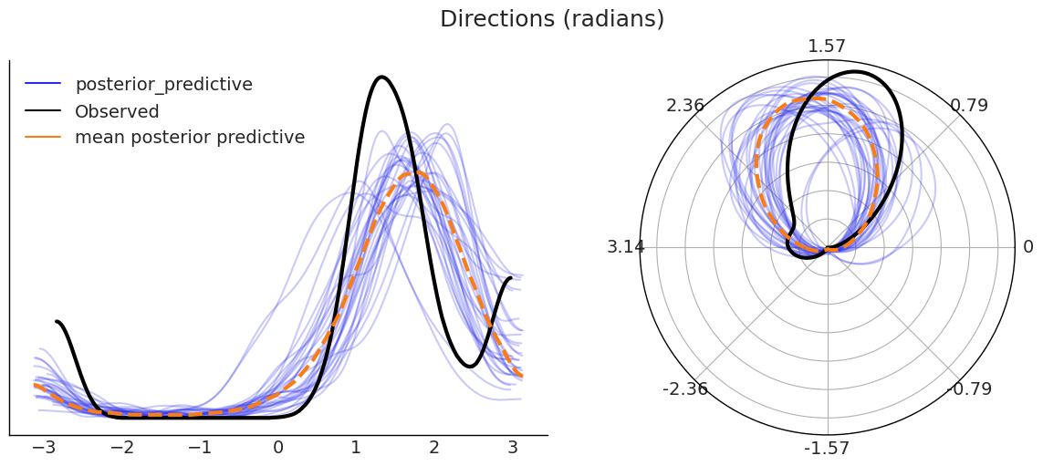 As a last step for this example we are going to do a posterior predictive check. In the figure below we have to panels showing the same data, with the only difference that the on the right is using a polar projection and the KDE are computing taking into account the circularity of the data.