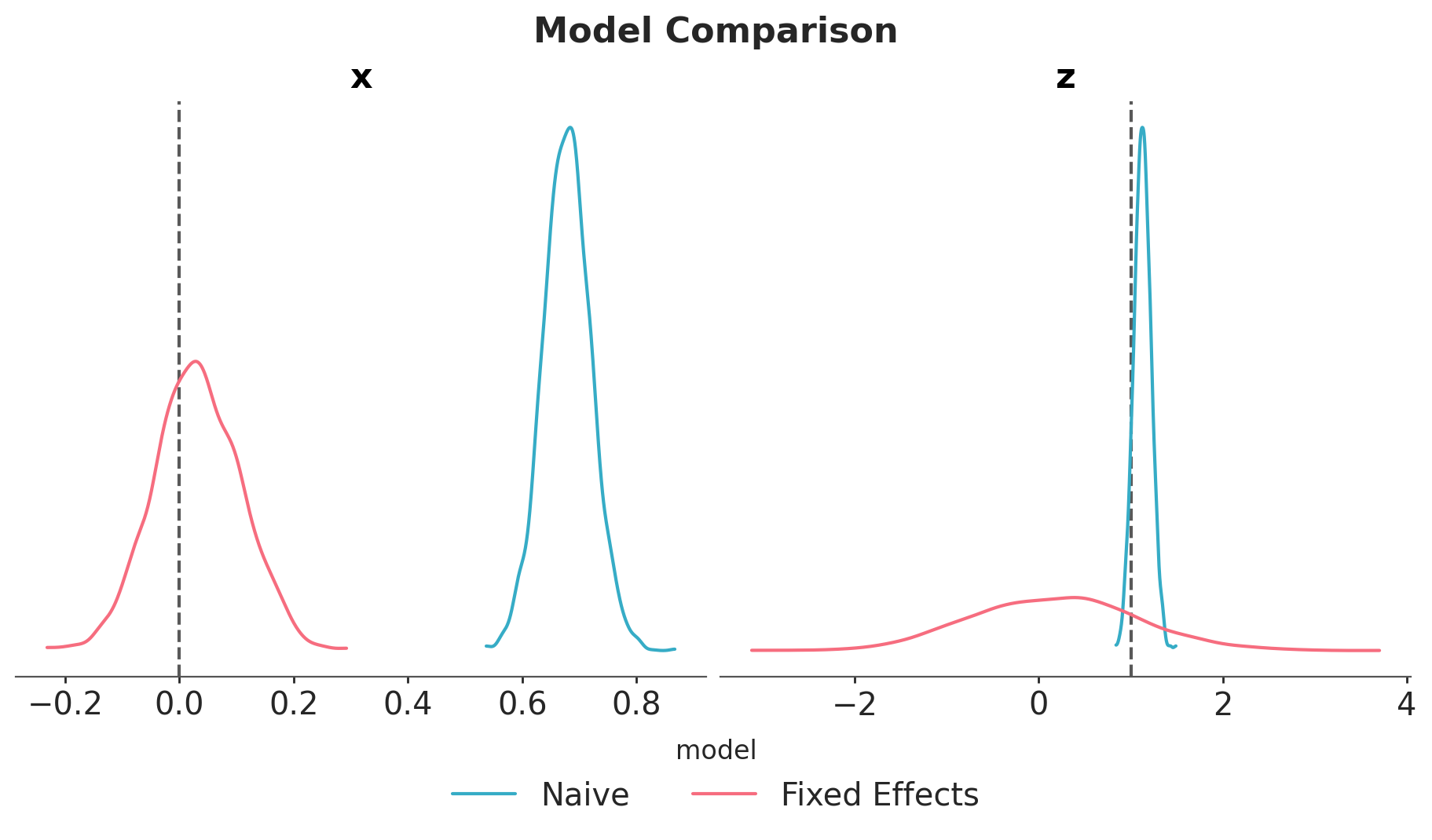 This model is able to estimate the true value of \(b_{xy}\) and \(b_{zy}\). We can compare the naive and fixed effects models parameter estimates: