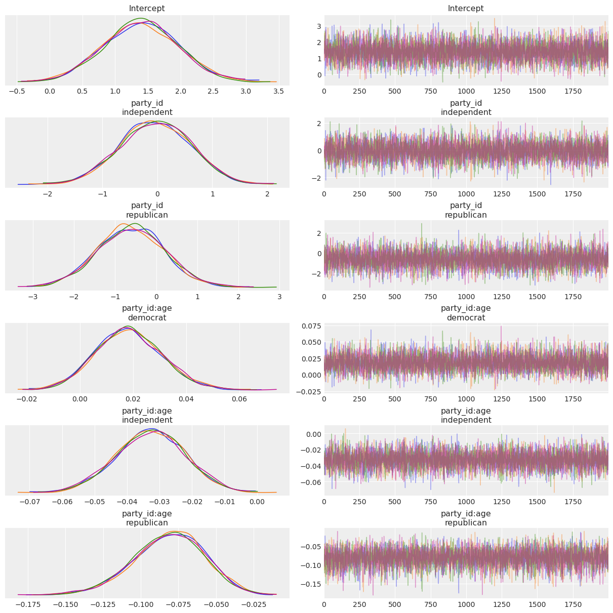 Since we’re Bayesian folks who draw samples from posteriors, we need to specify a prior for the parameters as well as a likelihood function before accomplishing our task. In this occasion, we’re going to use the default priors in Bambi and just note the likelihood is the product of \(n\) Bernoulli trials, \(\prod_{i=1}^{n}{p_i^y(1-p_i)^{1-y_i}}\) where \(p_i = P(Y=1)\) and \(y_i = 1\) if the vote intention is for Clinton and \(y_i = 0\) if Trump.