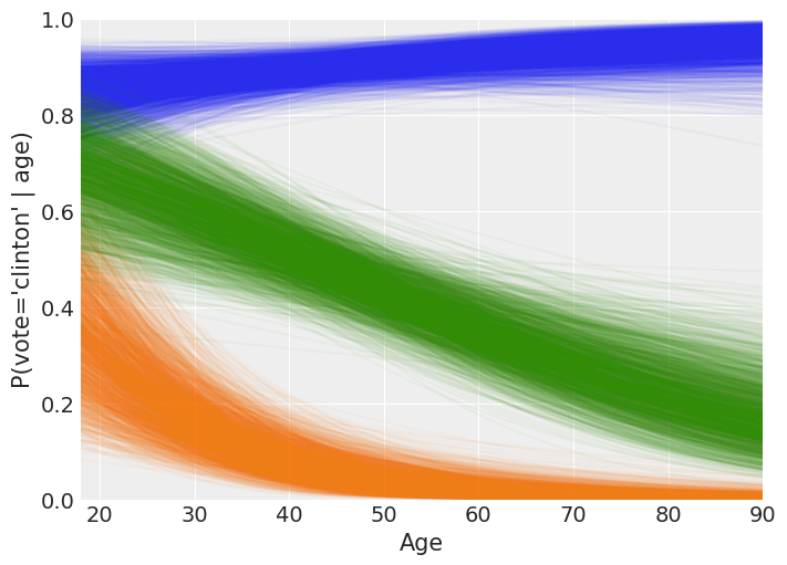 Finally, the mean probability of voting Clinton for the independents is around 0.7 for the youngest and decreases towards 0.2 as they get older (orange line). Since the spread of the lines is similar along all the ages, we can conclude our uncertainty in this estimate is similar for all the age groups.