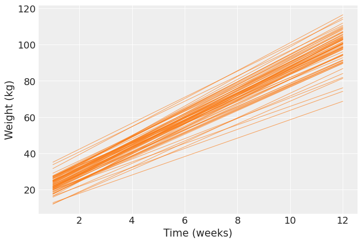 Here we’ll visualize the regression equations we have sampled for a particular pig and then we’ll compare the mean regression equation for all the 72 pigs in the dataset.