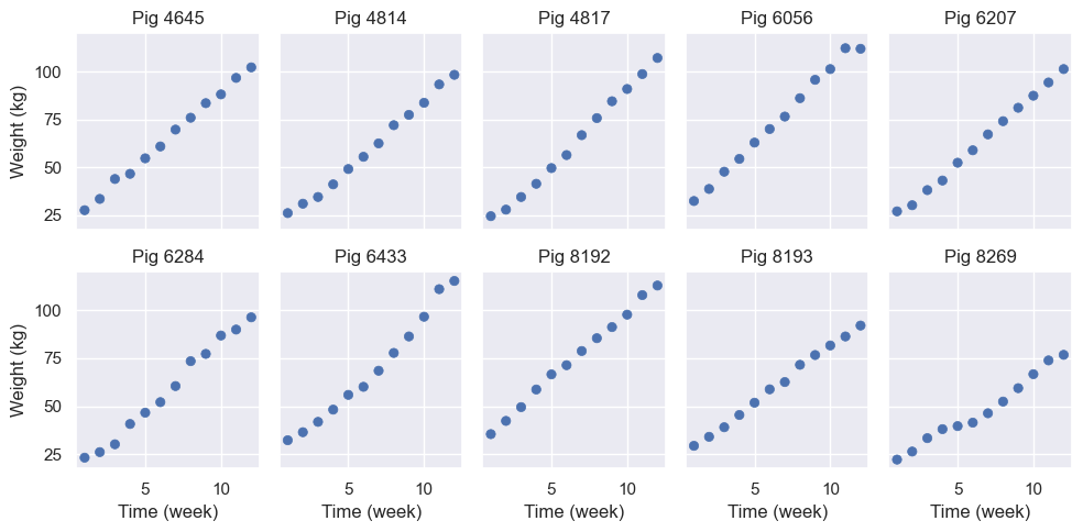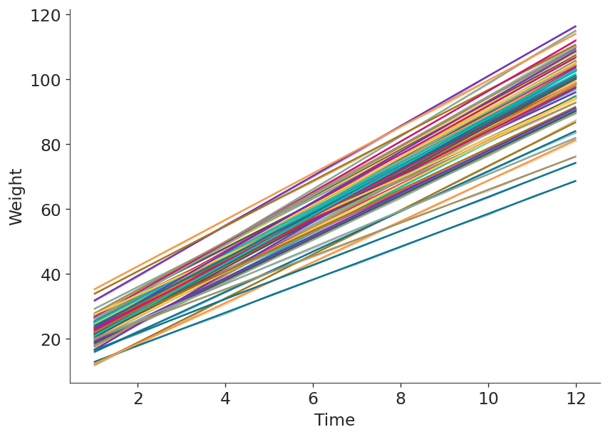 From the plot, time and weight seem to be linearly related. However, the slope and intercept vary pig by pig. So, we’ll estimate a model that allows varying intercepts and slopes for time for each pig.