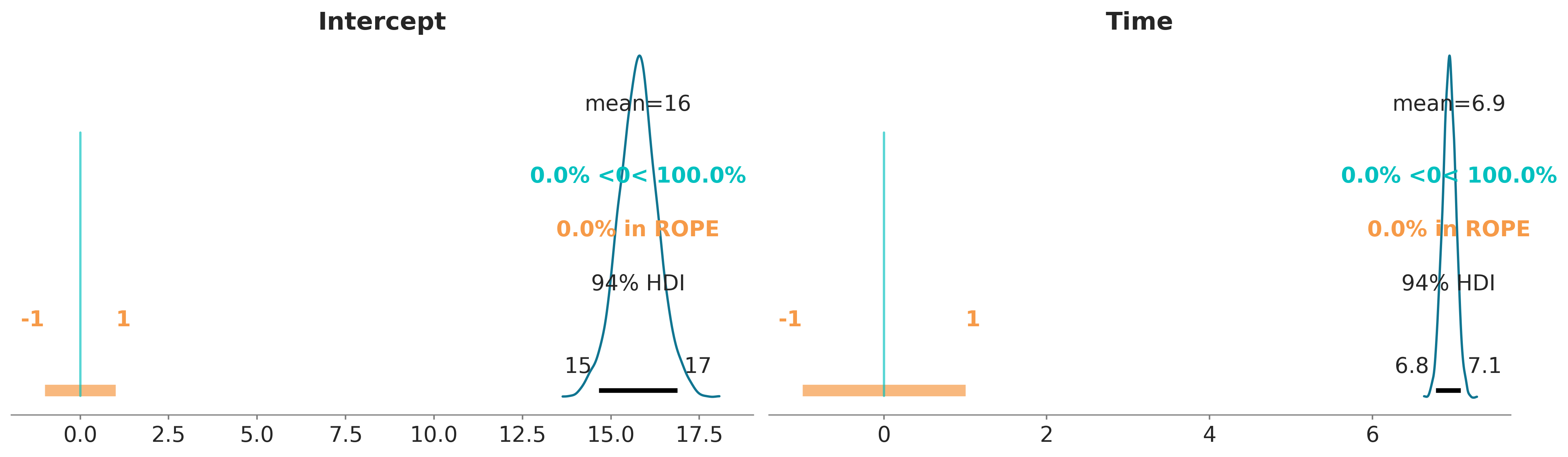 bmb_idata, var_names=["Intercept", "Time"], ref_val=0, rope=[-1, 1], figsize=(14, 4)