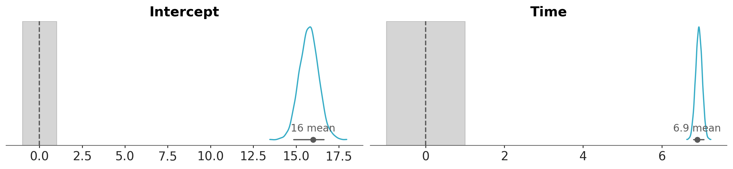 We can also plot the posterior overlaid with a region of practical equivalence (ROPE). This region indicates a range of parameter values that are considered to be practically equivalent to some reference value of interest to the particular application, for example 0. In the following plot we can see that the marginals posterior distributions for Intercept and Time fall outside of this range.