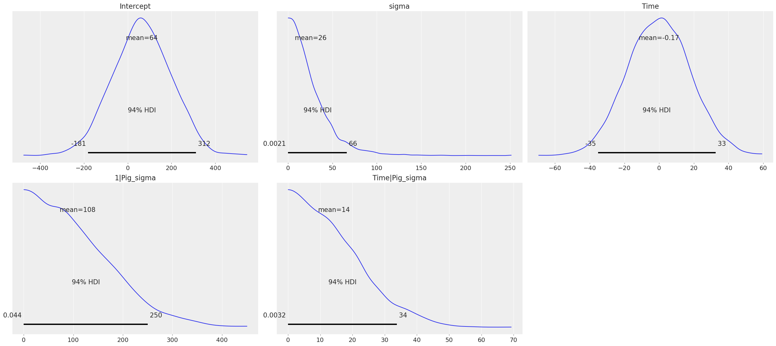 =["Intercept", "Time", "1|Pig_sigma", "Time|Pig_sigma", "sigma"]) az.summary(results, var_names