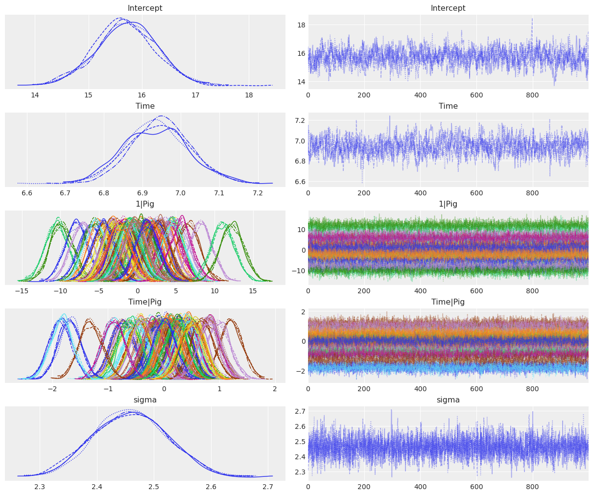 NUTS: [sigma, Intercept, Time, 1|Pig_sigma, 1|Pig_offset, Time|Pig_sigma, Time|Pig_offset]