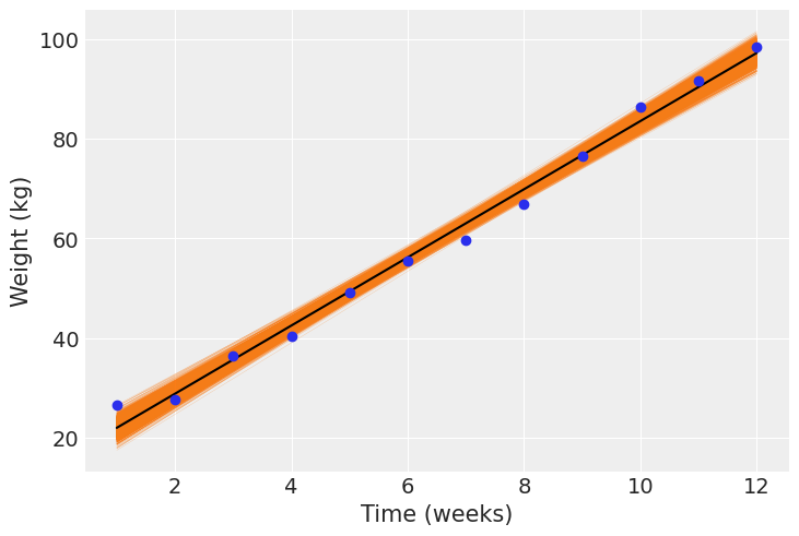 In the following plot we can see the 2000 linear regressions we have sampled for the pig ‘4601’. The mean regression line is plotted in black and the observed weights for this pig are respresented by the blue dots.