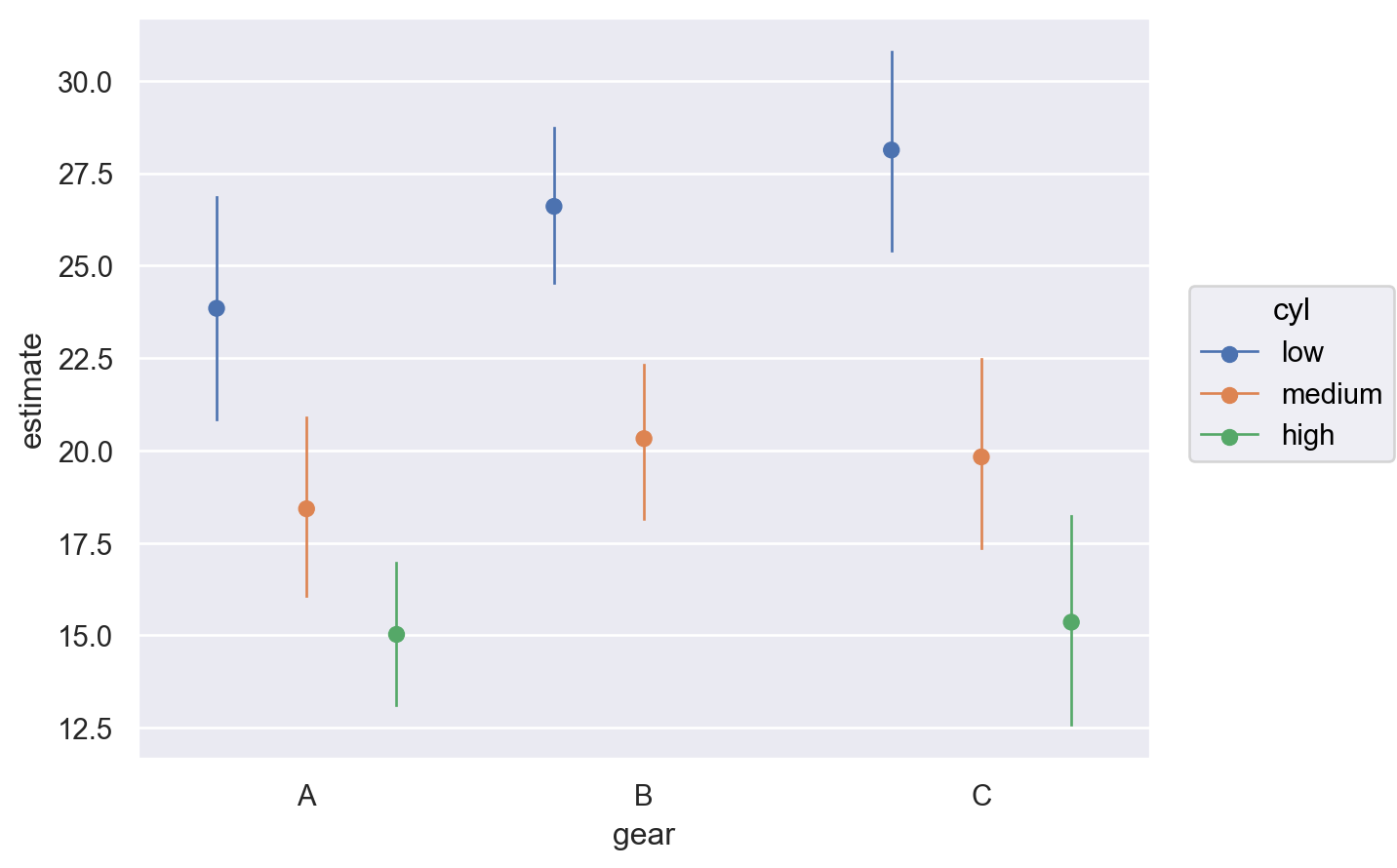 Furthermore, categorical covariates can also be plotted. We plot the the mean mpg as a function of the two categorical covariates gear and cyl below. The plot_predictions function automatically plots the conditional adjusted predictions for each level of the categorical covariate. Furthermore, when passing a list of covariates into the plot_predictions function, the list will be converted into a dictionary object where the key is taken from (“horizontal”, “color”, “panel”) and the values are the names of the variables. By default, the first element of the list is specified as the “horizontal” covariate, the second element of the list is specified as the “color” covariate, and the third element of the list is mapped to different plot panels.