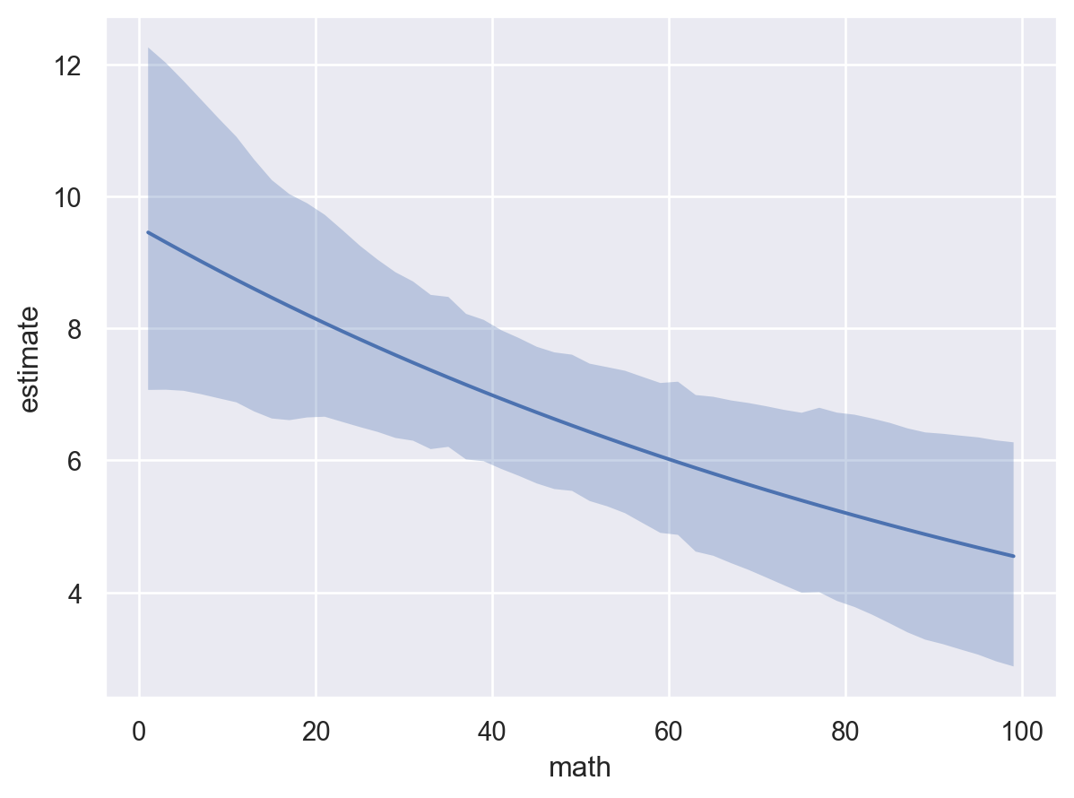 Additionally, predictions can be called to obtain the computed result directly. predictions returns a Result named tuple with two fields: summary and draws. The summary field is a pandas DataFrame containing the point estimates (posterior mean) and credible intervals for each row of the prediction grid. The draws field is an arviz.InferenceData object containing the full posterior samples used to compute the summary. The summary is useful for quick inspection and tabular reporting, while draws gives access to the complete posterior distribution for custom analyses or visualizations beyond the default summary statistics. The covariate columns in the summary dataframe are used to create the plot.