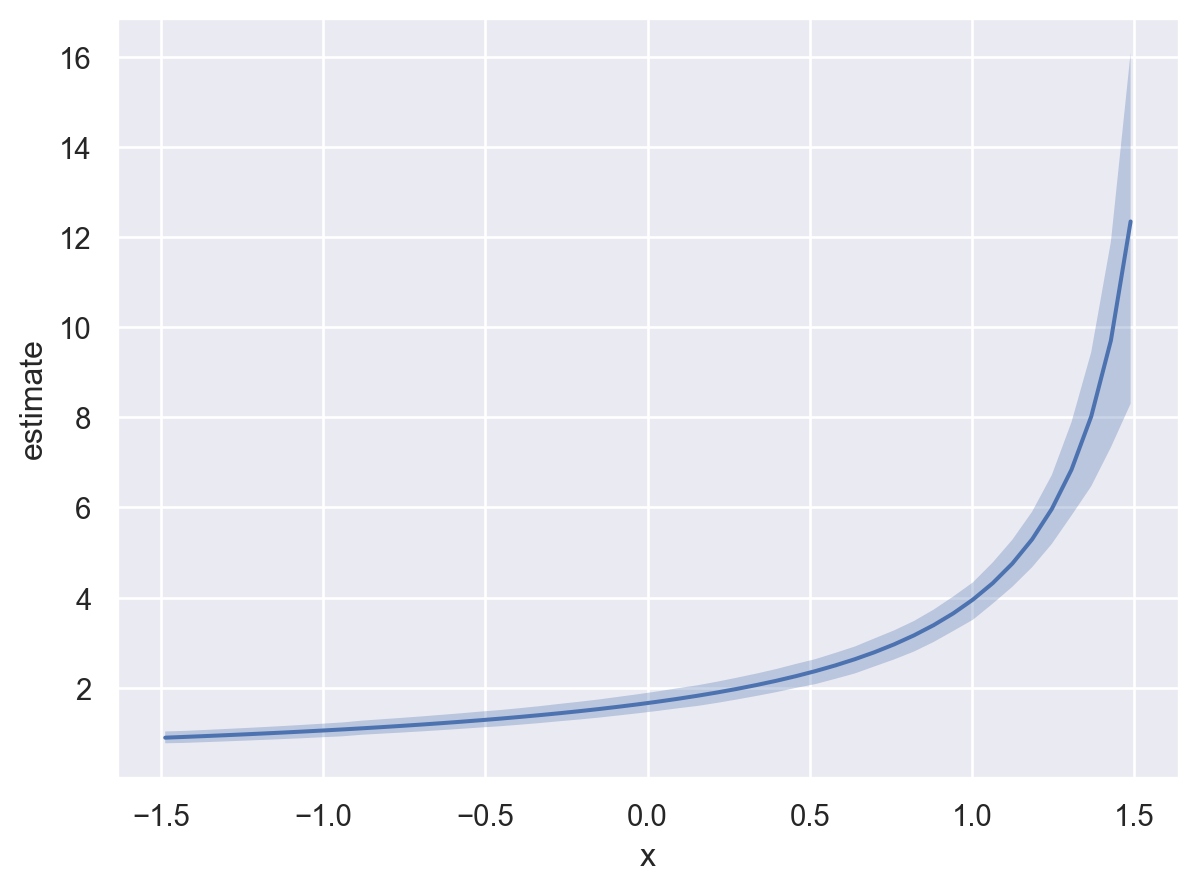 The model we defined uses a gamma distribution parameterized by alpha and mu where alpha utilizes a log link and mu goes through an inverse link. Therefore, we can plot either: (1) the mu of the response distribution (which is the default), or (2) alpha of the response distribution as a function of the explanatory variable \(x\).