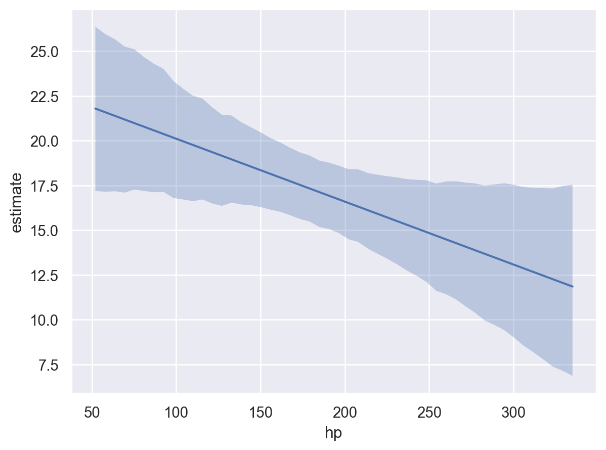 Now that we have fitted the model, we can visualize how a model parameter varies as a function of (some) interpolated covariate. For this example, we will visualize how the mean response mpg varies as a function of the covariate hp.