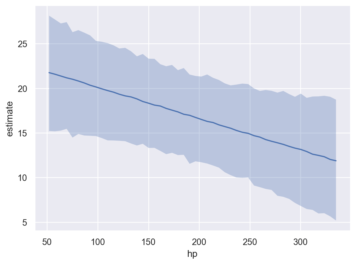 The Bambi model, ArviZ inference data object (containing the posterior samples and the data used to fit the model), and a list or dictionary of covariates, in this example only hp, are passed to the plot_predictions function. The plot_predictions function then computes the conditional adjusted predictions for each covariate in the list or dictionary using the method described above. The plot_predictions function returns a Seaborn objects Plot object that can be further customized.