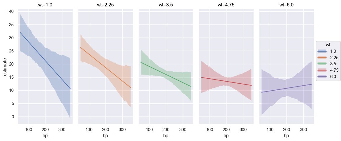 plot_predictions allows up to three covariates to be plotted simultaneously where the first element in the list represents the main (x-axis) covariate, the second element the group (hue / color), and the third element the facet (panel). However, when plotting more than one covariate, it can be useful to pass specific group and panel arguments to aid in the interpretation of the plot. Therefore, subplot_kwargs allows the user to manipulate the plotting by passing a dictionary where the keys are {"main": ..., "group": ..., "panel": ...} and the values are the names of the covariates to be plotted. For example, passing two covariates hp and wt and specifying subplot_kwargs={"main": "hp", "group": "wt", "panel": "wt"}.