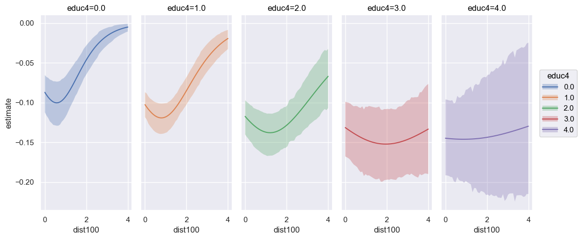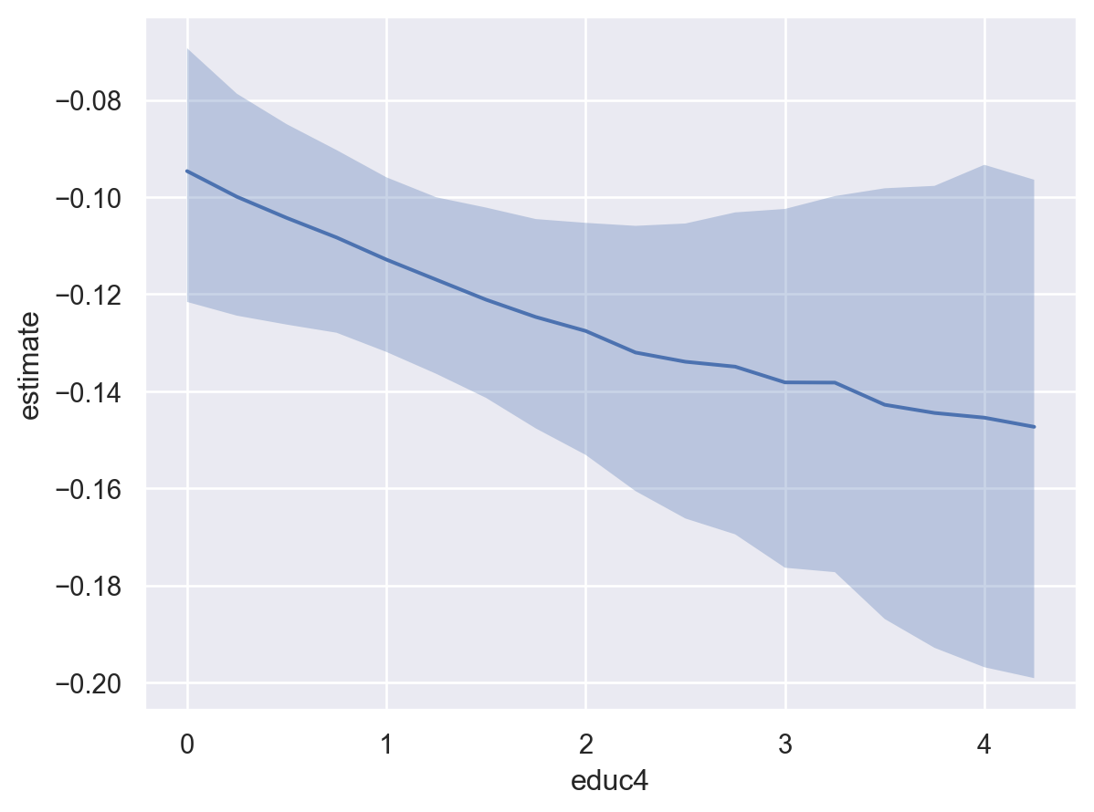 Averaging over all covariates may not be desired, and you would rather average by a group or specific covariate. To perform averaging by subgroups, users can pass a single or list of covariates to average_by to average over specific covariates. For example, if we wanted to average by educ4: