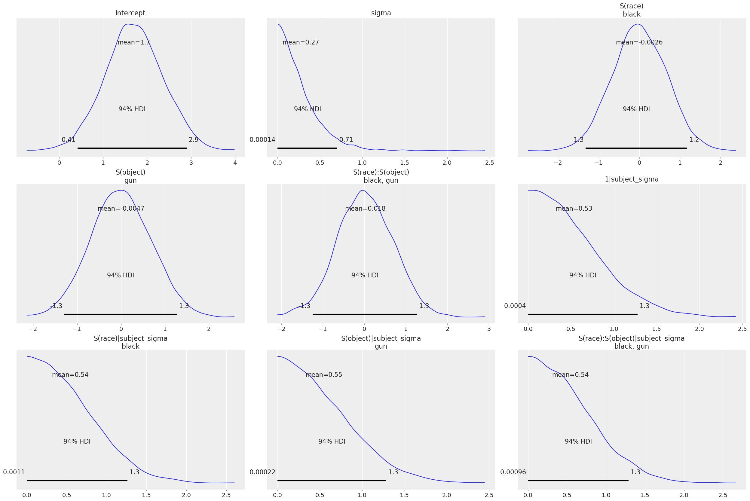 First let’s visualize the default priors that Bambi automatically decided on for each of the parameters. We do this by calling the .plot_priors()