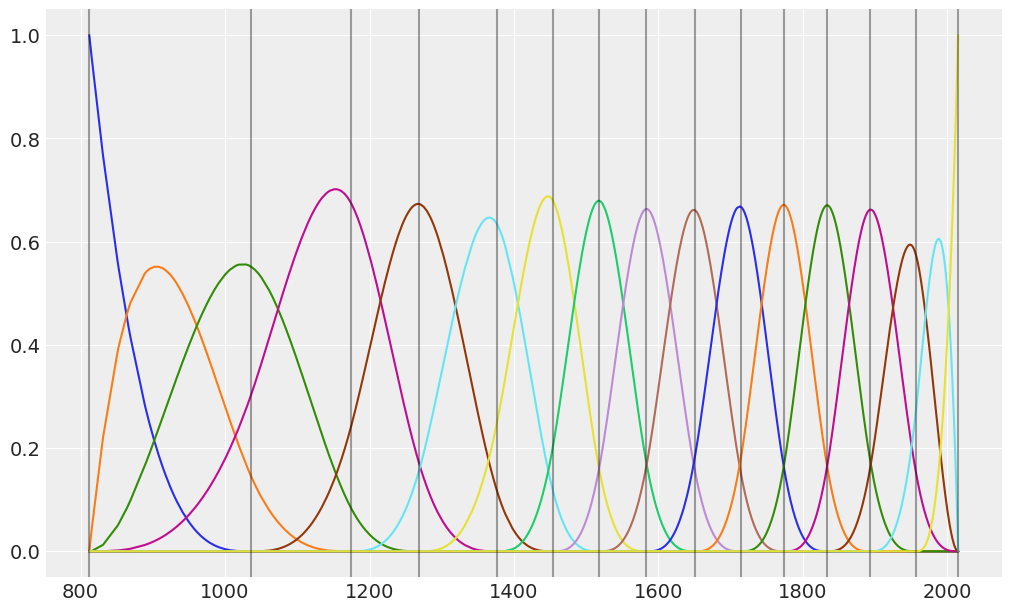 The spline will have 15 knots. These knots are the boundaries of the basis functions. These knots split the range of the "year"