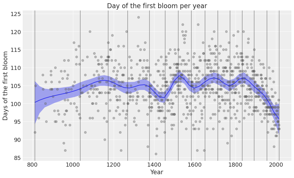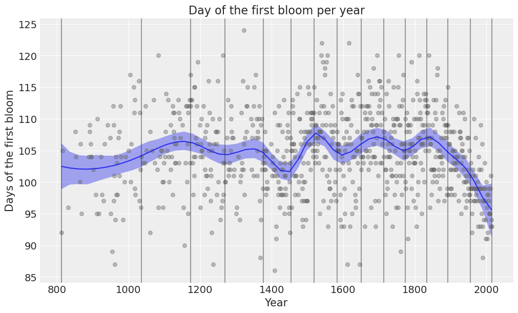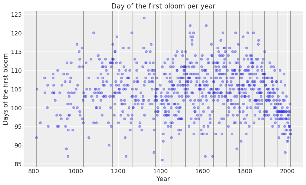 Richard McElreath popularized the Cherry Blossom dataset in the second edition of his excellent book Statistical Rethinking. This data represents the day in the year when the first bloom is observed for Japanese cherry blossoms between years 801 and 2015. In his book, Richard McElreath uses this dataset to introduce Basis Splines, or B-Splines in short.