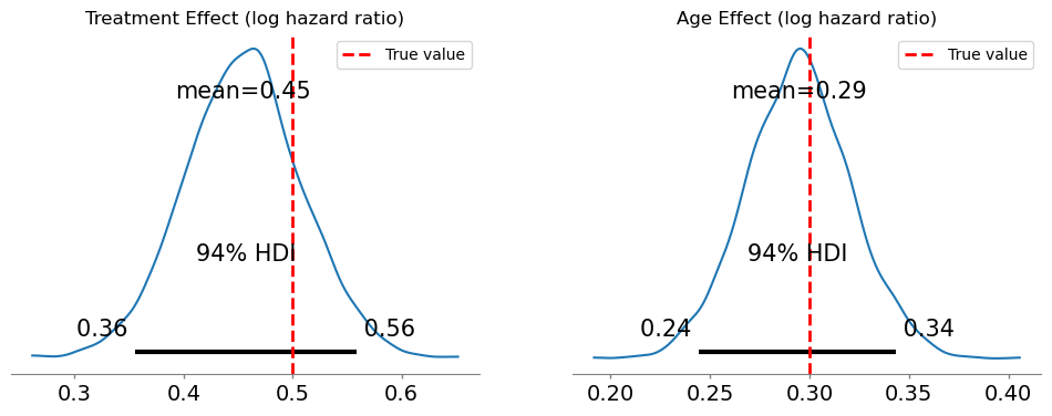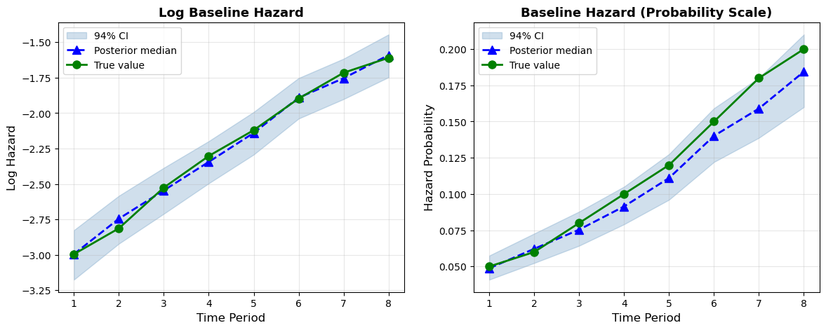 The LOO comparison confirms what we’d expect: the two models have similar predictive power. Any difference in predictive accuracy is negligible — well within the standard error of the LOO estimate. This is the typical outcome when hazards are moderate. The cloglog and Poisson formulations are two different parameterizations of the same underlying survival process, so they should (and do) agree.