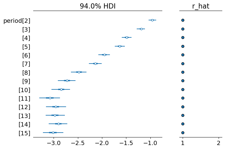 az.summary(results_spline, var_names=["bs(period, df=4)"])| mean | sd | hdi_3% | hdi_97% | mcse_mean | mcse_sd | ess_bulk | ess_tail | r_hat | |