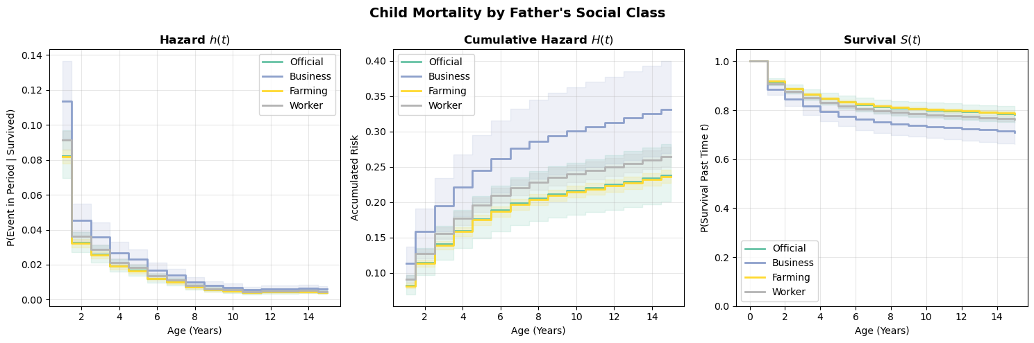 Hazard Function \(h(t)\): The probability of the event occurring in period \(t\), given survival to period \(t\):