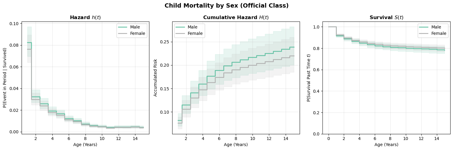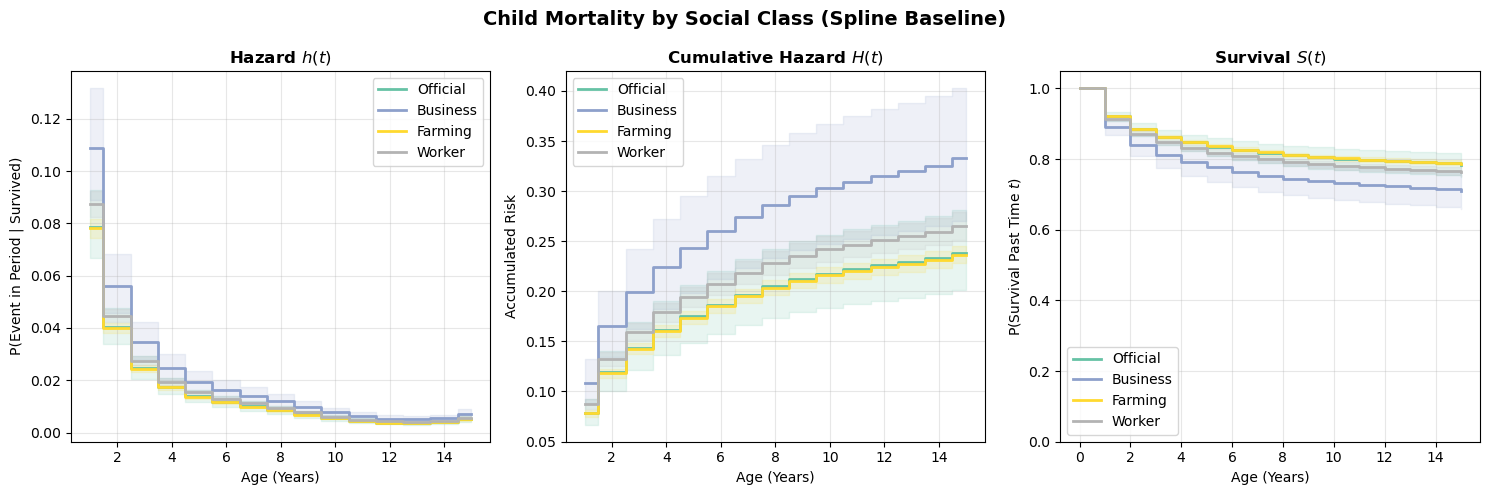 Compare these curves to the categorical-dummies version above. The spline model imposes smoothness on the baseline hazard, which can be a virtue (fewer parameters, less overfitting to noisy period-specific estimates) or a liability (if the true hazard profile has sharp features the spline can’t capture). In practice, the two approaches should broadly agree if the data is informative enough.