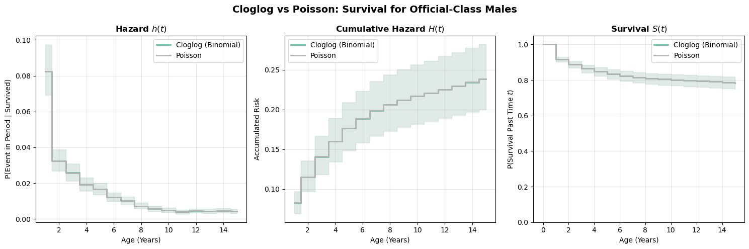 [curves_clog, curves_pois], title="Cloglog vs Poisson: Survival for Official-Class Males"