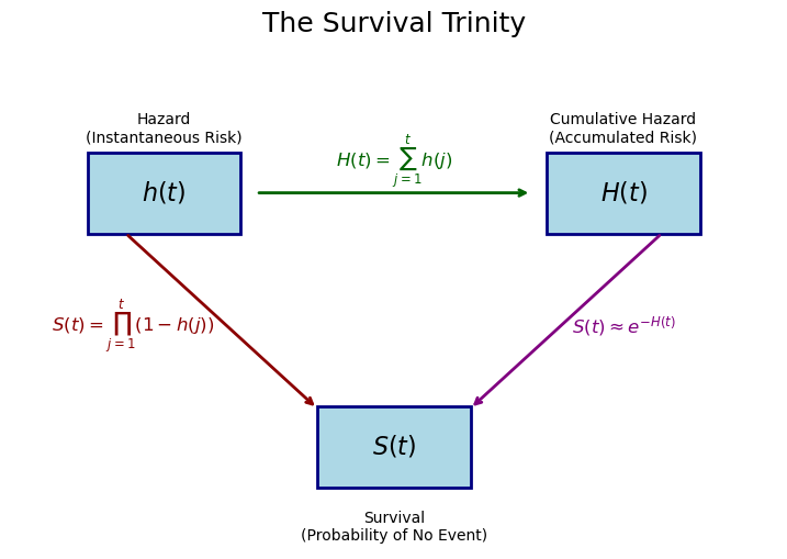 The survival trinity: \(h(t)\), \(H(t)\), \(S(t)\)
