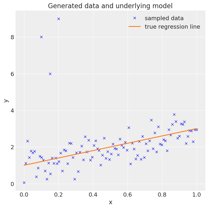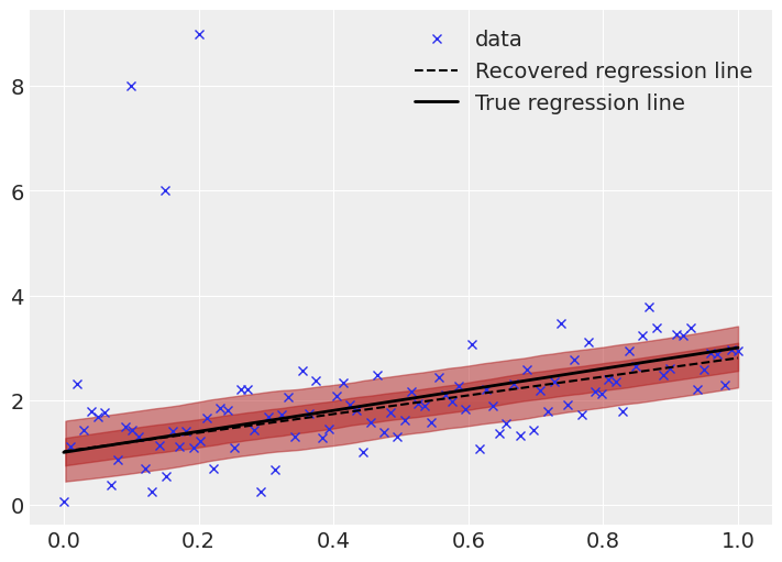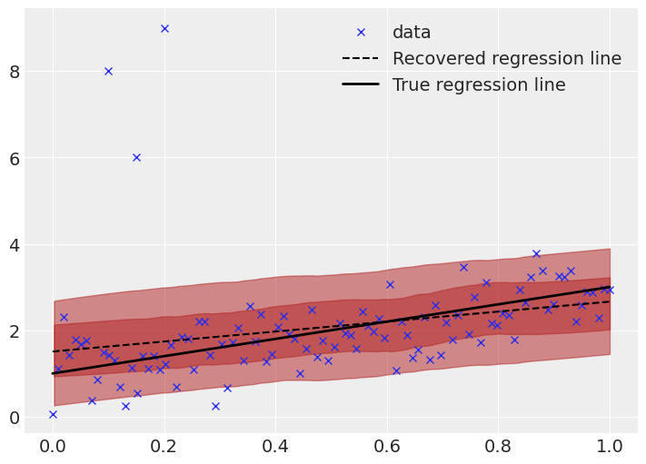 This is much better. The true and recovered regression lines are much closer, and the uncertainty bands are appropriate sized. The effect of the outliers is not entirely gone, the recovered line still slightly differs from the true line, but the effect is far smaller, which is a result of the Student T likelihood function ascribing a higher probability to outliers than the normal distribution. Additionally, this inference is based on sampling methods, so it is expected to have small differences (especially given a relatively small number of samples).