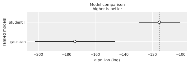 Here it is quite obvious that the Student T model is much better, due to having a clearly larger value of LOO.