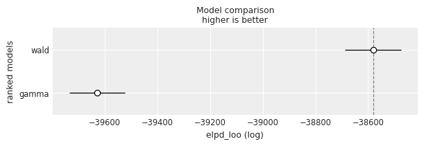 By default, ArviZ uses loo, which is an estimation of leave one out cross-validation. Another option is the widely applicable information criterion (WAIC). Since the results are in the log scale, the better out-of-sample predictive fit is given by the model with the highest value, which is the Wald model.